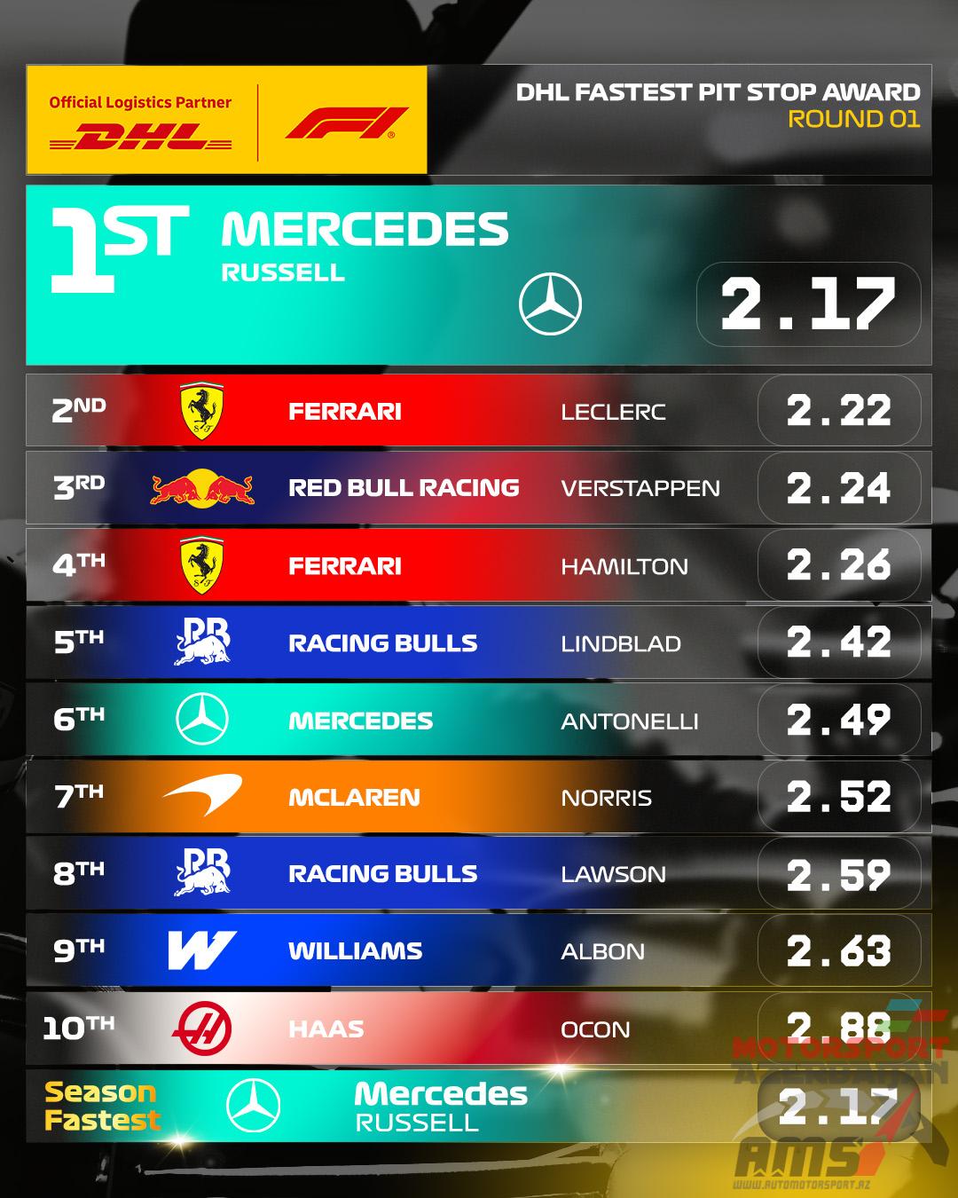В Мельбурне самый быстрый пит-стоп провели механики Mercedes, обслужив машину Джорджа Расселла за 2.17 секунды.