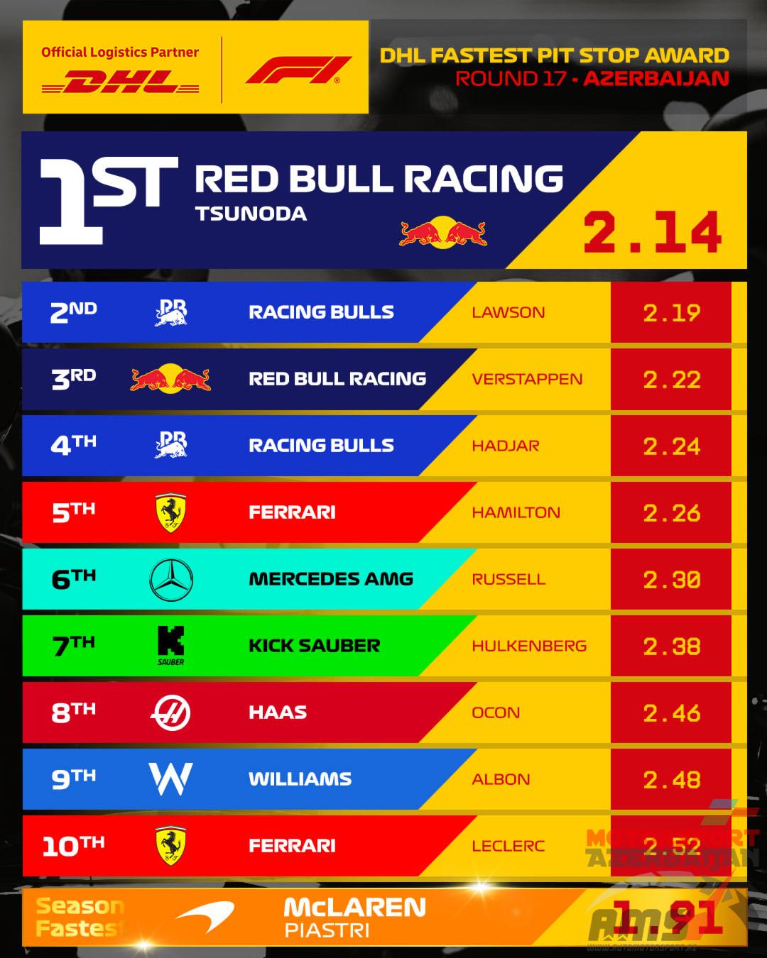 В Баку самый быстрый пит-стоп провели механики Red Bull Racing, обслужив машину Юки Цуноды за 2.14 секунды – результат не рекордный, но лучший в прошедшем Гран При.