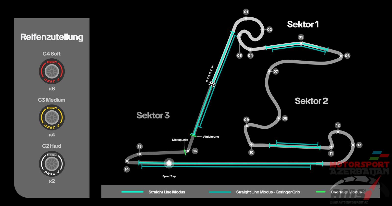 В условиях нормального сцепления использовать активную аэродинамику можно на четырёх участках, которые начинаются через 100 метров после 16-го поворота, через 60 метров после четвёртого, через 100 метров после 10-го и через 60 метров после 13-го.