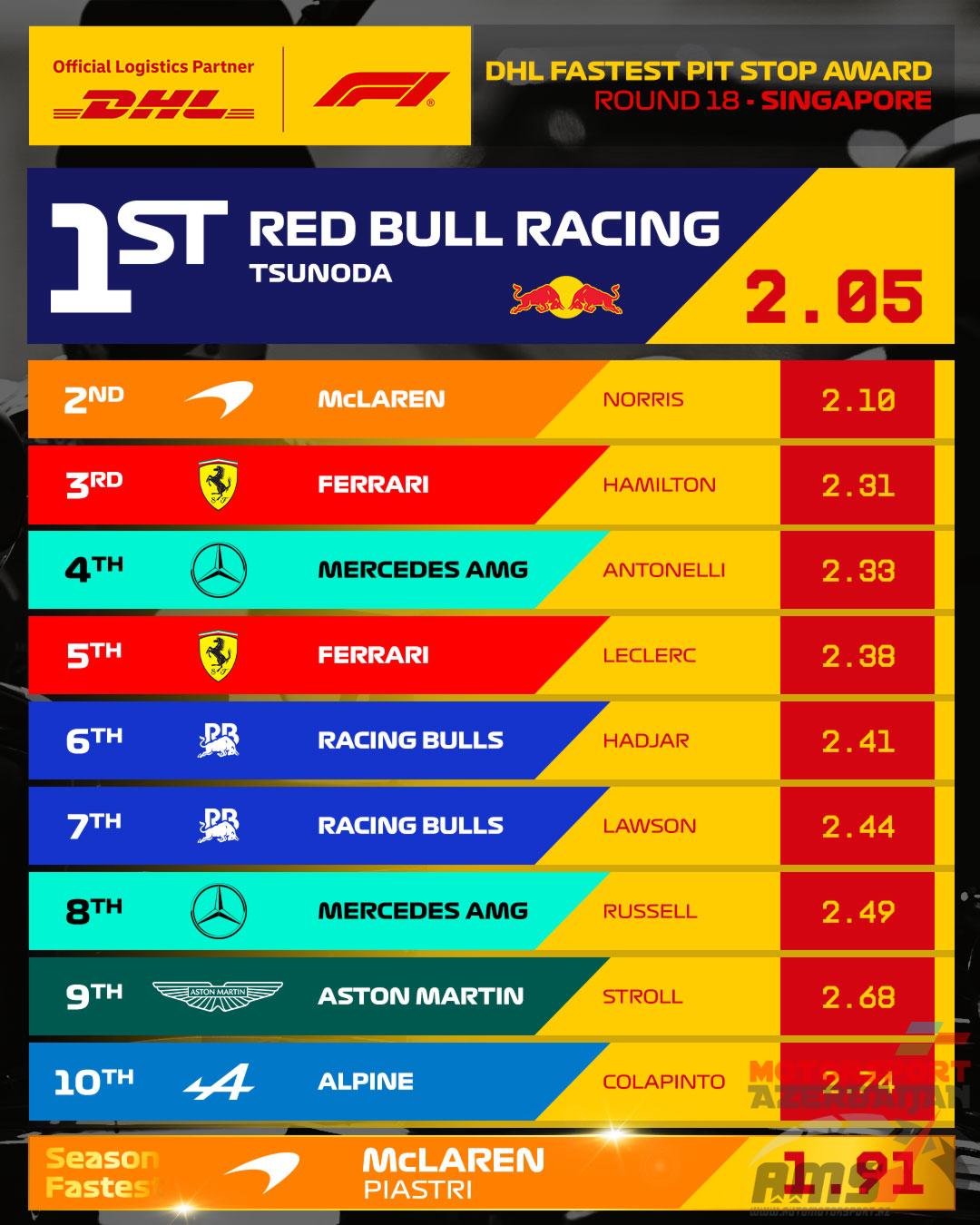 В Сингапуре самый быстрый пит-стоп провели механики Red Bull Racing, обслужив машину Юки Цуноды за 2.05 секунды – результат не рекордный, но лучший в прошедшем Гран При.
