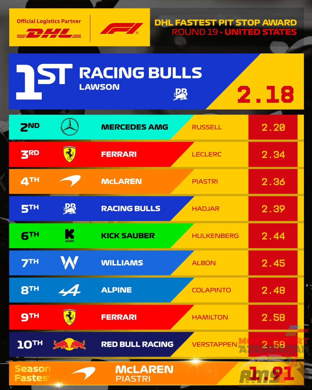 В Остине самый быстрый пит-стоп провели механики Racing Bulls, обслужив машину Лиама Лоусона за 2.18 секунды – результат не рекордный, но лучший в прошедшем Гран При.